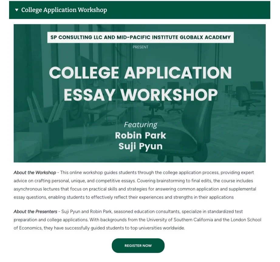 SPC Education has partnered with Mid-Pacific Institute to create an online workshop aimed at guiding students through the college application process. This workshop provides expert advice on crafting personal, unique, and competitive essays. Covering everything from brainstorming to drafting and editing, the course includes asynchronous lectures that focus on practical skills and strategies for answering both common application and supplemental essay questions, enabling students to effectively reflect their experiences and strengths in their applications.